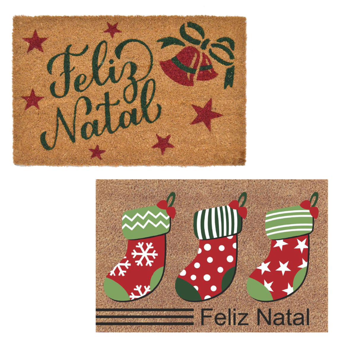 Está escrito Feliz Natal e tem duas opções, uma com o desenho de sinos e estelas e outra com botas natalinas.