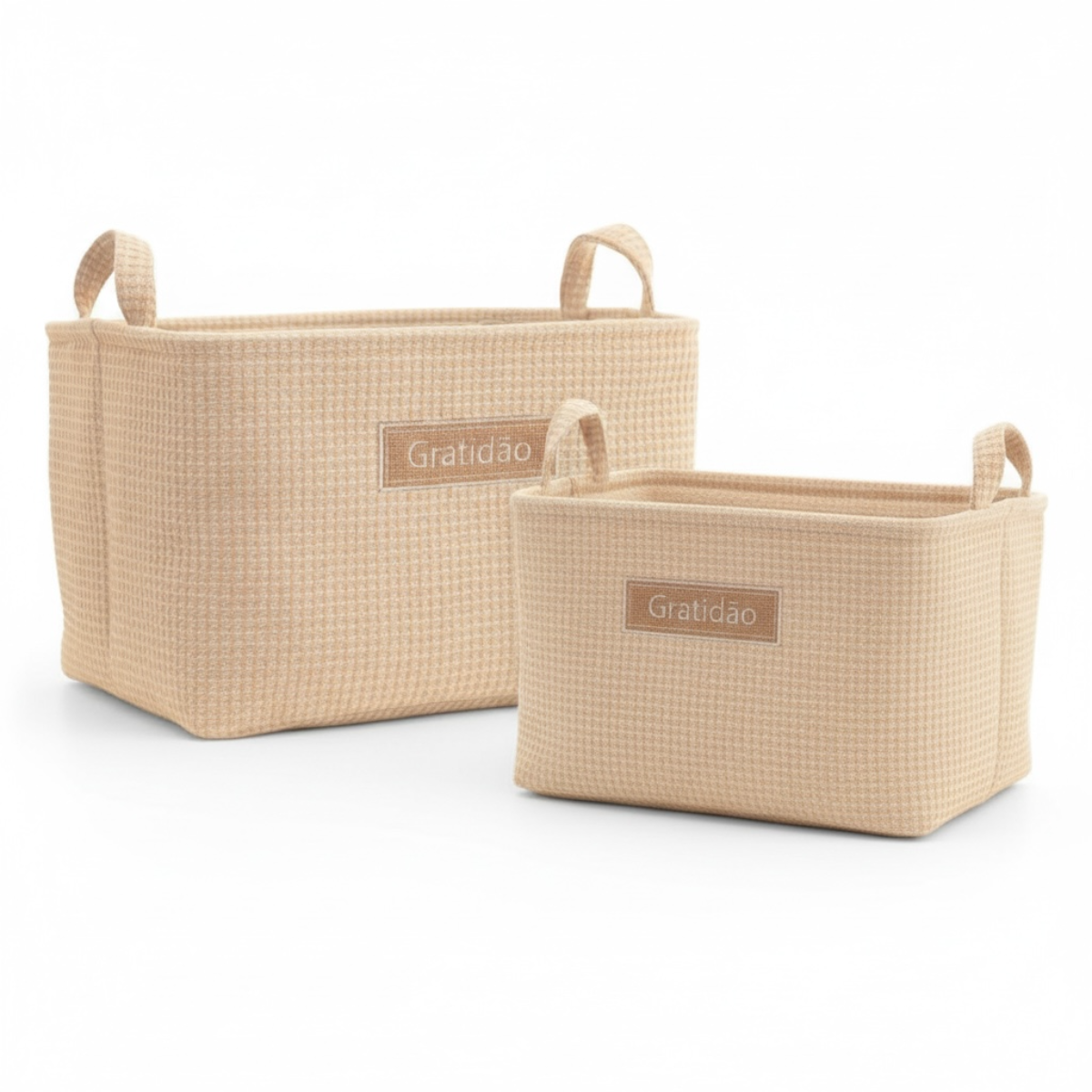 O cesto organizador multiuso em tecido bege com textura waffle se destaca pelo visual natural e pelo bordado Gratidão, que acrescenta um toque acolhedor e delicado ao ambiente. Seu design discreto e a estrutura firme mantêm o formato mesmo em uso, permitindo que a peça componha o espaço de forma leve e harmoniosa.