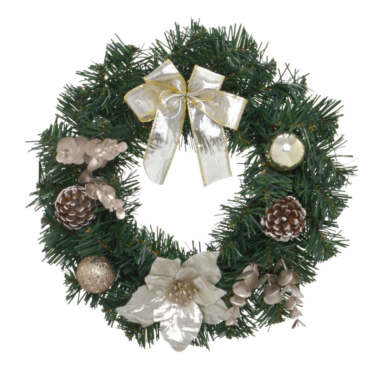 Adicione um toque de elegância à sua decoração natalina com esta belíssima guirlanda decorativa. Feita com ramos de pinheiro em PVC, ela é adornada com detalhes encantadores, como um laço, pinhas e flores brilhantes na cor champagne, criando uma combinação perfeita de cores festivas e brilho.
