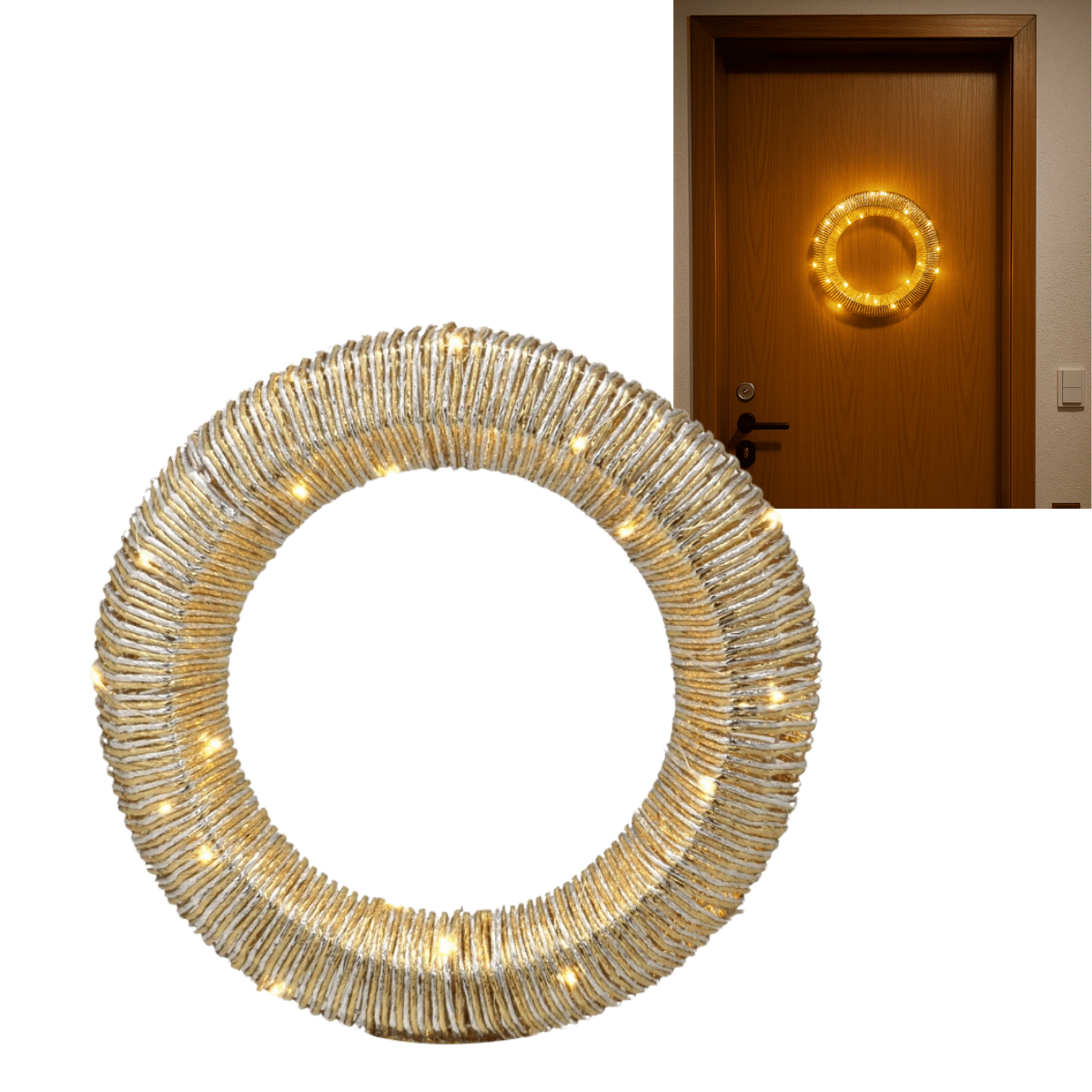 Moderna, minimalista e muito elegante ela tem fios dourados e prateados e leva pequenas luzes em led, a alimentação é por pilhas.