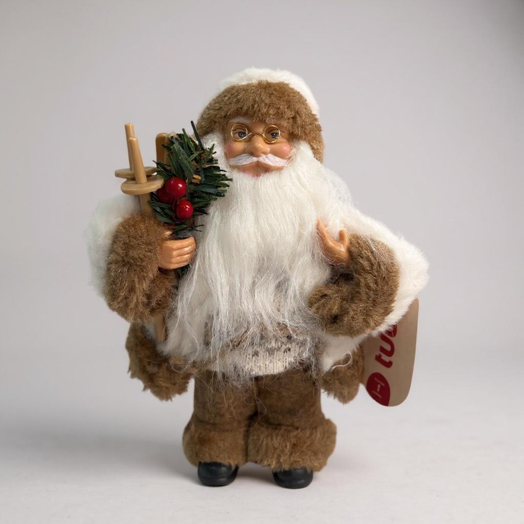 Este é um Papai Noel diferente, ele está vestido com um suéter natalino, casaco pedudo branco e calças marrom e leva seu esqui na mão direita.