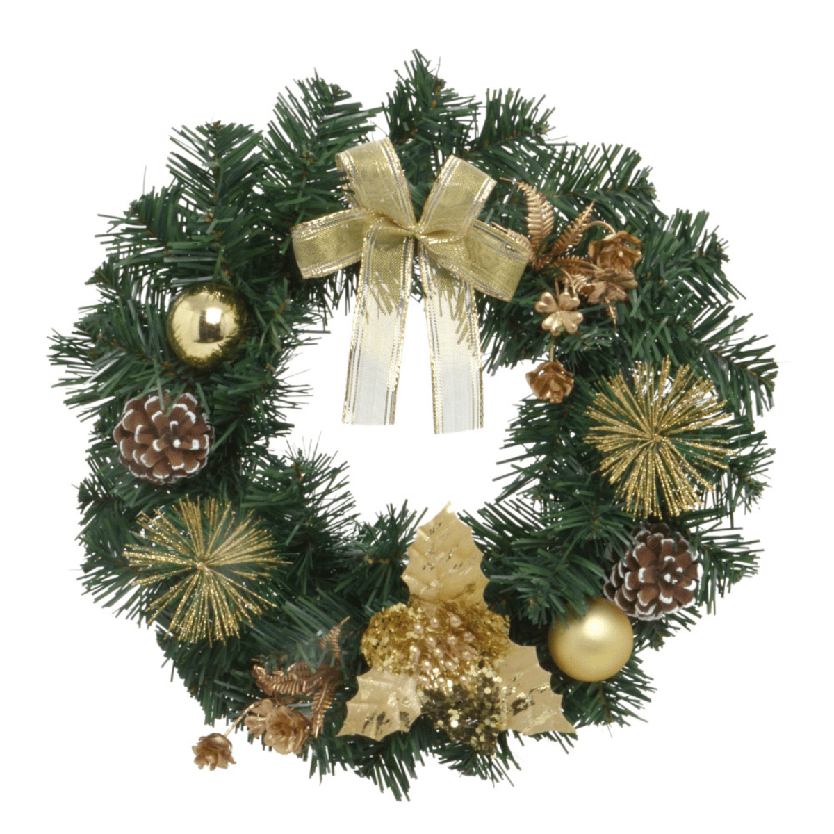 Esta Guirlanda tem enfeites tradicionais como as bolas douradas, bico de papagaio e laço. Ela será um adorno luxuoso para a entrada da casa.